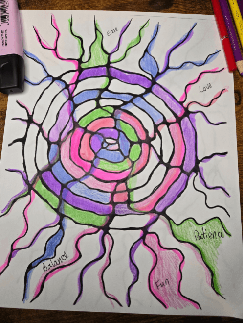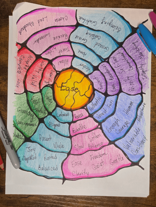 A calming 30-minute guided coloring session using a printable off-set mandala. You’ll reflect on and choose your Word of the Year through gentle prompts, with plenty of suggested words and space to honour a word that feels right for the kind of year you want to create.